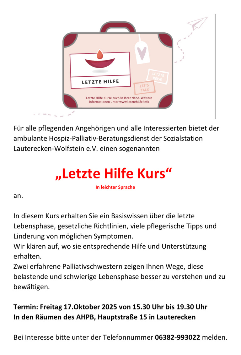 Für alle pflegenden Angehörigen und alle Interessierten bietet der ambulante Hospiz-Palliativ-Beratungsdienst der Sozialstation Lauterecken-Wolfstein e.V. einen sogenannten